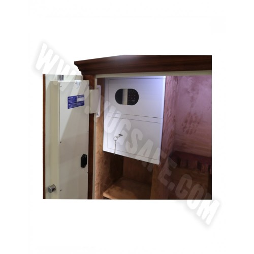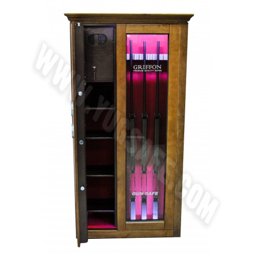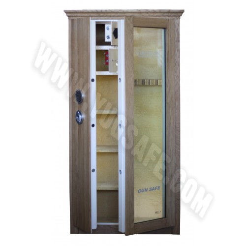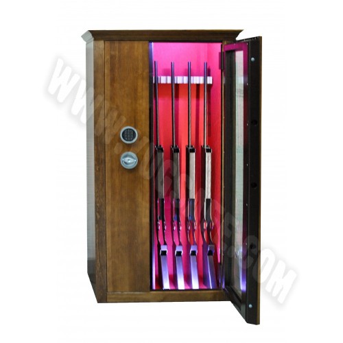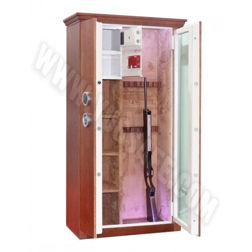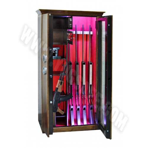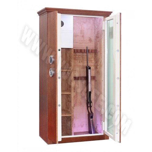 Оружейный сейф ПАРИТЕТ-К GE.700.E WOOD с бронированным стеклом отделан деревом( дуб, цвет натуральное дерево). Для придания сейфу премиальности, он так же оснащен внутренней подсветкой, а внутренние стенки отделаны флоком. Конструкция двери сделана специальным образом, так называемый "зацеп" не позволяет открыть сейф ломом или монтировкой. Так же на сейфе установлены специальные петли "антисрез". Дополняет все это броне пластина от высверливания и выбивания замков и вращающиеся ригеля. Внутри сейфа вы найдете удобные съемные полки, держатели для шомполов, ложемент для стволов с изменяемым местом установки (для любой высоты ружья до 1450 мм), а так же удобную конструкцию дверей которая позволяет использовать все пространство сейфа без ограничений. Сейф оружейный GG.700.E WOOD это отличный выбор для тех кто предпочитает кроме надежности оружейного сейфа еще и отличный внешний вид.