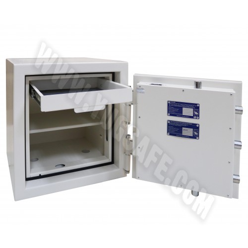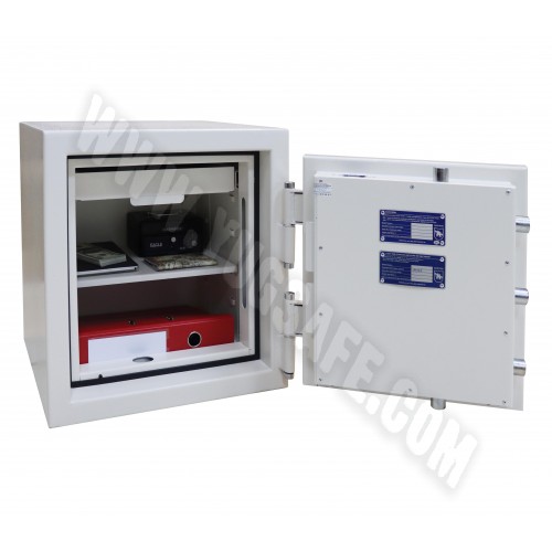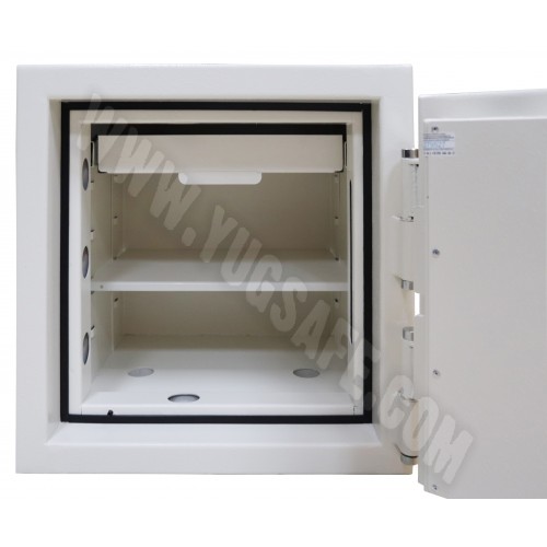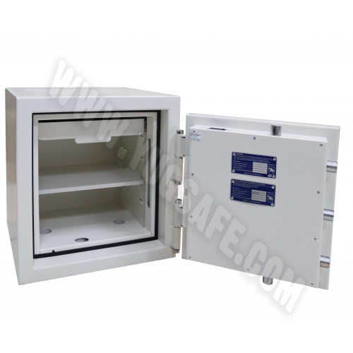 Сейф CL.II.50.E это надежность банка в Вашем доме или офисе. Когда- то, сейфы этой серии продавали только банкам, так как именно им требовался такой уровень надежности.  Позднее их немного доработали и они стали пригодны для массового потребления. Сейф серии CL это 45 мм стенки типа сэндвич, но в отличие от панелей, основой служит прочный бетон марки 400 с добавками и компонентами делающими его еще прочнее, а вокруг железо 2 мм толщины. Дверь это особая часть сейфа, можно сказать это его сердце. Двери этих сейфов кроме бетона имеют еще ряд защитных механизмов. Детали мы раскрывать не будем, а то Ваша покупка станет бесполезной, но поверьте, того кто станет вскрывать Ваш сейф через дверь ждет немало сюрпризов. Расскажем только о ригельной системе, которая состоит из пяти 25 мм вращающихся ригелей, выдвигаются на три стороны, а со стороны петель сейфа - ригеля «анти срезы». Замки могут быть различными: от ключевых или кодовых механических, до электронных и их комбинаций. Что касается какой лучше, тут уже Вам решать, а в помощь наша статья (в разделе статьи). Покупая сейф CL.II Вы приобретаете вещь, которая прослужит Вам долгие годы. А если решите приобрести сейф с комбинированной системой запирания, то сейф внутри будет отделан ковролином  для комфортного использования и эстетики. И чуть не забыл все сейфы серии CL.II.50.E снабжены термо-лентой BASF (Германия), которая служит для запечатывания щелей сейфа при пожаре, так что Ваш сейф защитит содержимое как минимум на 30 минут и от пожара. Это подтверждает тест по стандарту ДСТУ EN 15659 класс огнестойкости 30Р.  Содержимое кстати, вполне комфортно может расположится внутри сейфа, это обеспечивает съемная полка с регулируемым шагом установки.