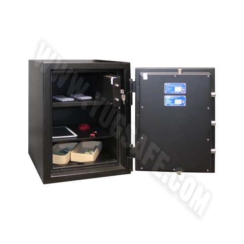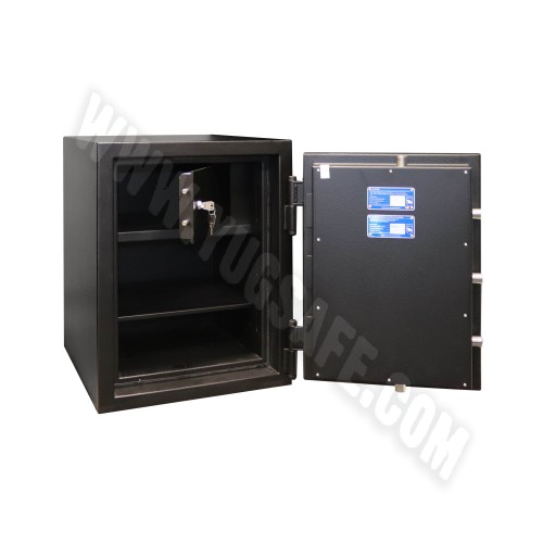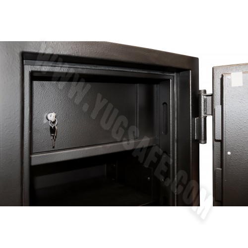 Сейф CL.II это надежность банка в Вашем доме или офисе. Когда- то, сейфы этой серии продавали только банкам, так как именно им требовался такой уровень надежности.  Позднее их немного доработали и они стали пригодны для массового потребления. Сейф серии CL это 45 мм стенки типа сэндвич, но в отличие от панелей, основой служит прочный бетон марки 400 с добавками и компонентами делающими его еще прочнее, а вокруг железо 2 мм толщины. Дверь это особая часть сейфа, можно сказать это его сердце. Двери этих сейфов кроме бетона имеют еще ряд защитных механизмов. Детали мы раскрывать не будем, а то Ваша покупка станет бесполезной, но поверьте, того кто станет вскрывать Ваш сейф через дверь ждет немало сюрпризов. Расскажем только о ригельной системе, которая состоит из пяти 25 мм вращающихся ригелей, выдвигаются на три стороны, а со стороны петель сейфа - ригеля «анти срезы». Замки могут быть различными: от ключевых или кодовых механических, до электронных и их комбинаций. Что касается какой лучше, тут уже Вам решать, а в помощь наша статья (в разделе статьи). Покупая сейф CL.II Вы приобретаете вещь, которая прослужит Вам долгие годы. А если решите приобрести сейф с комбинированной системой запирания, то сейф внутри будет отделан ковролином  для комфортного использования и эстетики. И чуть не забыл все сейфы серии CL.II снабжены термо-лентой BASF (Германия), которая служит для запечатывания щелей сейфа при пожаре, так что Ваш сейф защитит содержимое как минимум на 30 минут и от пожара. Это подтверждает тест по стандарту ДСТУ EN 15659 класс огнестойкости 30Р.  Содержимое кстати, вполне комфортно может расположится внутри сейфа, это обеспечивает съемная полка с регулируемым шагом установки.